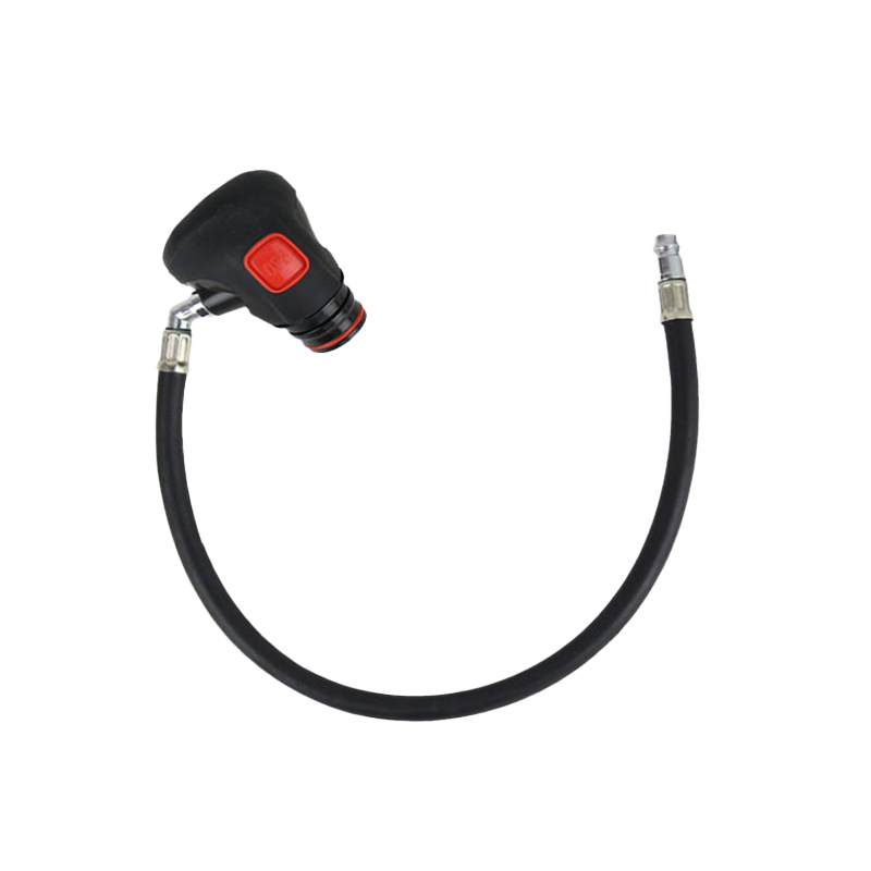 | În partea de jos este un buton de alimentare manuală cu aer, care poate fi apăsat pentru a furniza automat aer dacă butonul de oprire manuală eșuează și, în al doilea rând, debitul de aer crește automat odată ce utilizatorul nu simte că alimentarea cu aer este suficientă și atinge acest. În plus, permite o ieșire a unei părți din presiunea aerului neutilizată în furtunul de presiune medie, făcând astfel ușoară verificarea și dezasamblarea conectorului rapid. | |